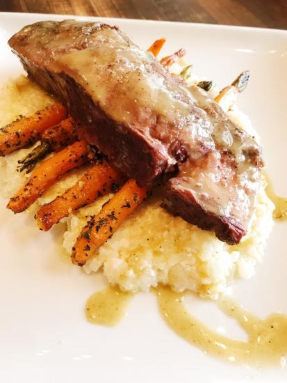 Ready to get extra cozy? Peach & the Porkchop is providing you that savory, comfort food experience. Their beef short rib comes with risotto, carrots, crispy sage, and a maple vinaigrette. Perfect for pairing with a glass of wine on their patio.
