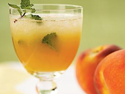 3 to 4 oz rum or vodka 3 large basil leaves, torn up 1 to 2 oz peach puree( can buy or make (frozen peaches from small bag, let thaw, add to blender, add 2 oz lemon juice , 2 oz simple syrup, puree, can freeze for later or use) 1/2 oz lime juice or sour mix* Stir all ingredients together, add ice, top with soda water and lime wedge.