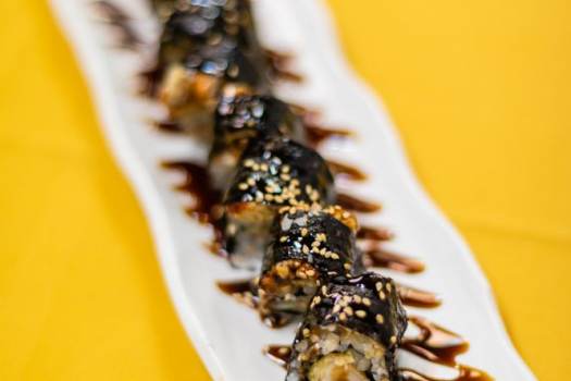 Festive kitchen featuring Japanese hibachi tables with performing chefs,...