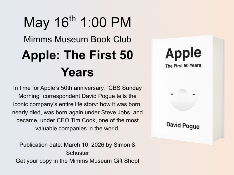 Join us on Saturday, May 16 at 2 PM at Mimms Museum for an engaging discussion of Apple’s history and impact.