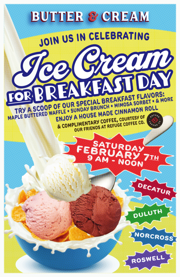 Ice Cream for Breakfast Day is February 7th! Join Butter & Cream for their annual Ice Cream for Breakfast Day Celebration. Shops will open at 9 am and offer a special menu with cinnamon rolls, hot coffee, and a few special breakfast flavors. The first few guests receive a free Butter & Cream mug.