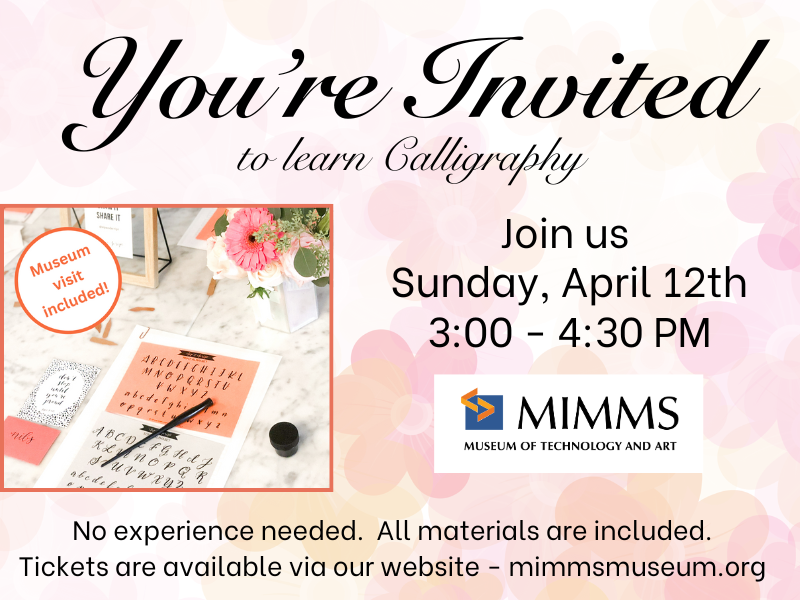 Join us at Mimms Museum of Technology and Art for an interactive workshop that teaches you the fundamentals of modern calligraphy! During the workshop, all the basics will be covered and by the time you leave class you’ll have all the tips and techniques to create an elegant, eye-catching work of art. Whether you’re a complete beginner or looking to refine your strokes, this workshop provides the perfect environment to develop your skills.