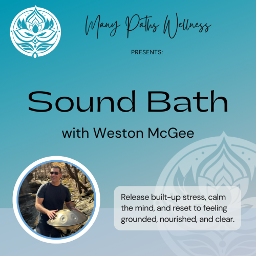Relax. Reset. Reconnect. Join us for a deeply soothing sound bath experience with Weston McGee, a gifted sound healer and lifelong musician who blends intention, intuition, and vibration to create a space of restoration and inner stillness. In each session, Weston crafts a melodic and meditative soundscape using the ethereal tones of the handpan, crystal singing bowls, and chimes. These gentle yet powerful frequencies help to calm the nervous system, clear stagnant energy, and bring the mind and body into a state of balance and harmony. Whether you’re seeking stress relief, emotional clarity, spiritual connection, or simply space to rest and receive, this sound bath is a powerful and accessible practice for all. No prior experience is necessary—just come as you are and allow yourself to be supported by sound. Benefits may include: Nervous system regulation and deep relaxation Emotional balance and clarity Improved sleep and energy flow A gentle meditative state with ease A stronger connection to your inner self Please bring: a yoga mat. About Weston McGee Weston McGee is a sound bath facilitator and lifelong musician who integrates his passion for music with a deep respect for the healing power of vibration. Trained under renowned sound healers Malte Marten and Billy Zanski, Weston brings a grounded, heartfelt presence to his sessions—offering a masculine balance to the typically feminine-dominant energy healing space. With over 20 years of experience creating music, Weston blends the meditative tones of the handpan, crystal bowls, and chimes to craft deeply immersive soundscapes that invite nervous system release, emotional clarity, and inner alignment. His approach is both intuitive and intentional, creating an environment where participants can unwind, reset, and tune in to their own inner wisdom. Weston is a welcome addition to the Many Paths Wellness family, aligning beautifully with our mission to support healing, self-discovery, and energetic balance through a wide variety of modalities and perspectives.